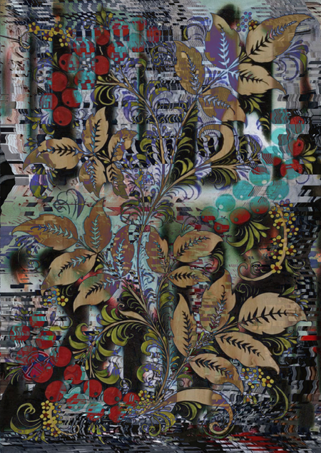 Визуальный язык проекта балансирует на грани узнаваемости и разрушения. Особое внимание уделяется текстурам — я создаю «поврежденные» поверхности, где традиционная роспись, стройный порядок принта и узнаваемые элементы разных периодов соседствуют с пиксельным шумом.