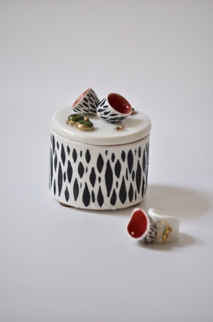 В основе коллекции лежит идея, что один визуальный образ может воплощаться в разных сферах жизни человека. Так, ваза и шкатулка из сказочного сада шагнула к нам на палец или костюм и сопровождает нас на новом эмоциональном уровне.