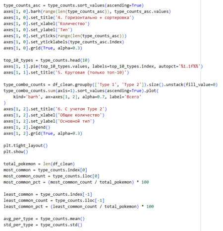 1. Линейчатая гистограмма с учетом Type1 2. Круговая диаграмма с выявлением топ-10 3. Линейчатая гистограмма с учетом Type1 и Type2