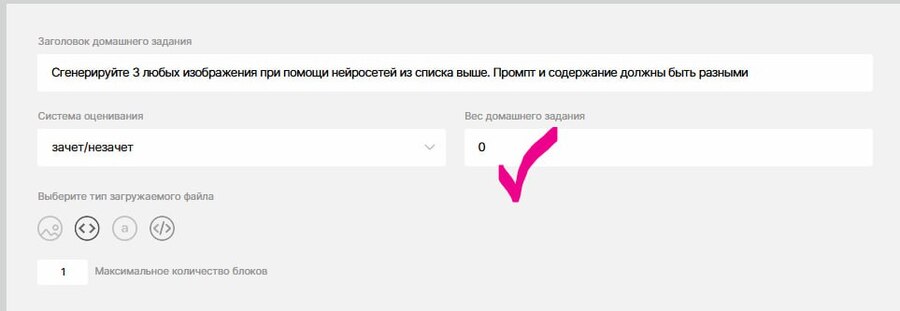 Следующие требования установки Веса домашнего задания должны соблюдаться всеми преподавателями: - обычное ДЗ — «зачет/незачет» и вес 0; - ДЗ на промежуточную оценку — «10-и бальная система» и вес 1 (стандартно).