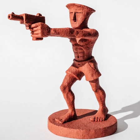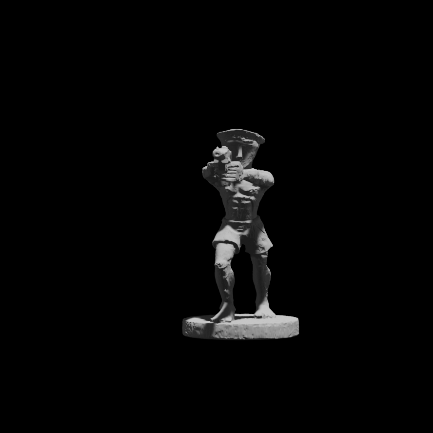 Промпт: a simple small one-color statue of a half-naked man with a curved cone for a head, wielding a gun, circular stand, white background, full height shot