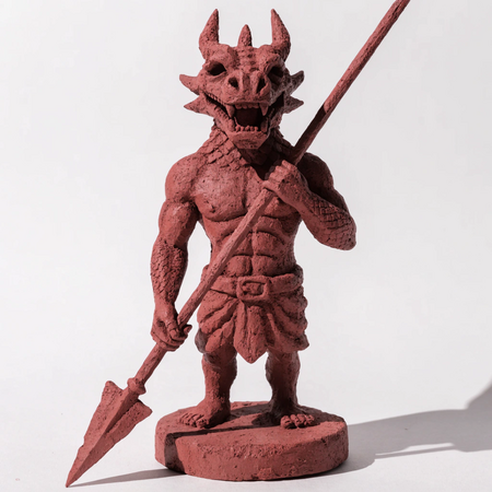 Промпт: a simple small one-color statue of a half-naked man with a dragon head, wielding a spear, standing on a circular stand, white background, full height shot