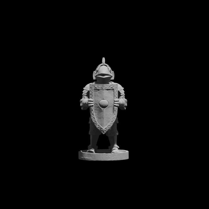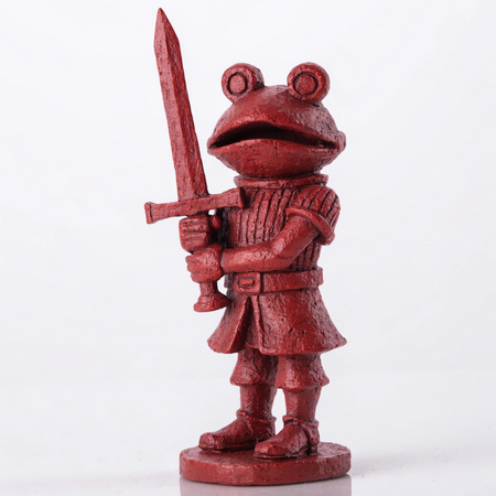 Промпт: a simple one-color small statue of a knight holding a sword, wearing a frog helmet, standing on a circular stand, full height shot, white background