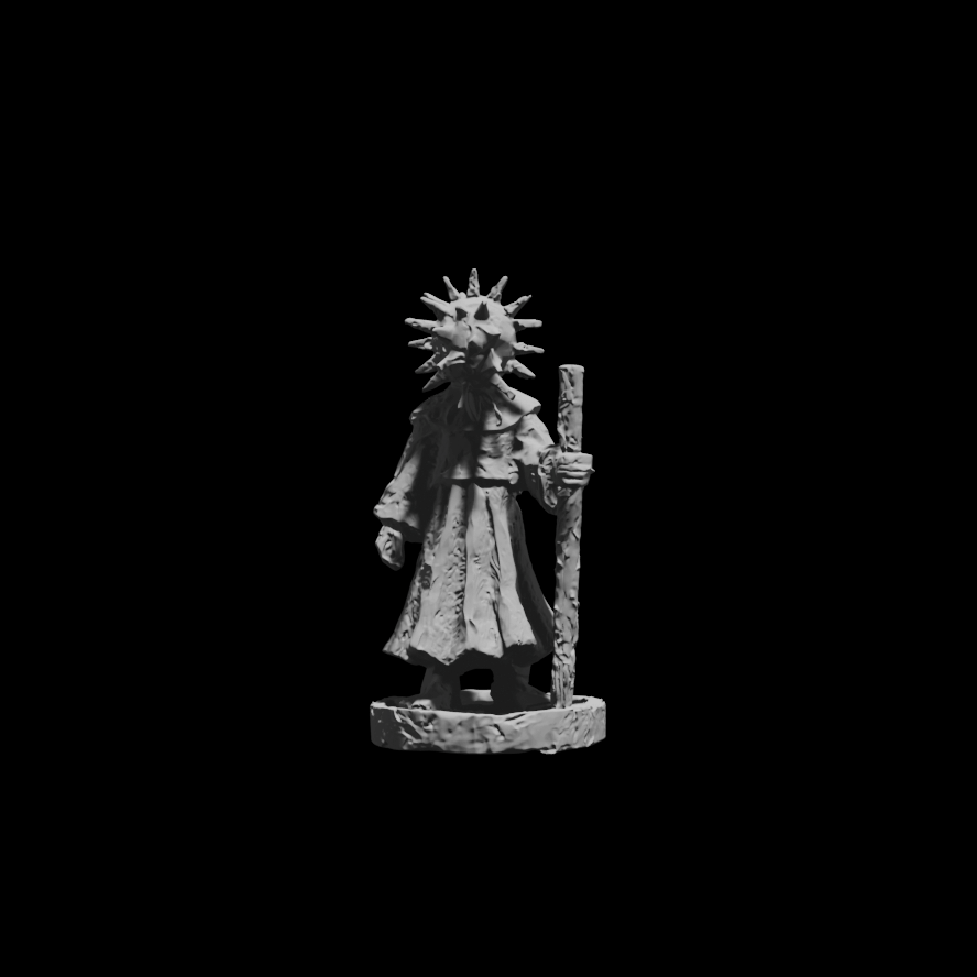 Промпт: a simple one-color small statue of a knight wearing robes, holding a stick, spiky sphere for a head, standing on a circular stand, white background