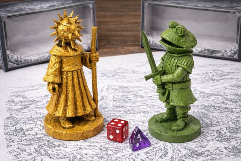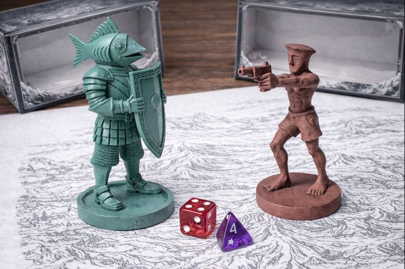 3. Сгенерируй фотографию, качество HD, свет студийный. вид сверху на деревянный стол, на нем лежит белое игровое поле, на нем серым нанесен рисунок горной местности в стилистике гравюры. сверху на поле стоят друг напротив друга два героя из прикрепленных фото. на заднем плане лежат раскрытые серые коробки с прозрачной лицевой вставкой. рядом с фигурками лежат три разноцветных полупрозрачных игральных кубика: красный D6, фиолетовый D4. замени героев на фото, на прикрепленные референсы