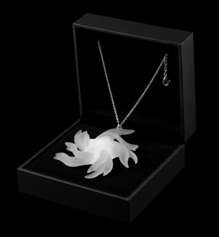 Прозрачный материал усиливает ощущение магии и чего-то внеземного, создавая эффект мягкого внутреннего свечения. Матовая полупрозрачная поверхность почти растворяется на фоне тела, становясь метафорой слияния искры и творческой души человека
