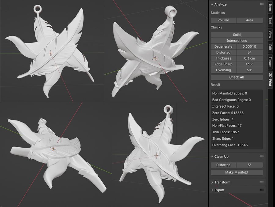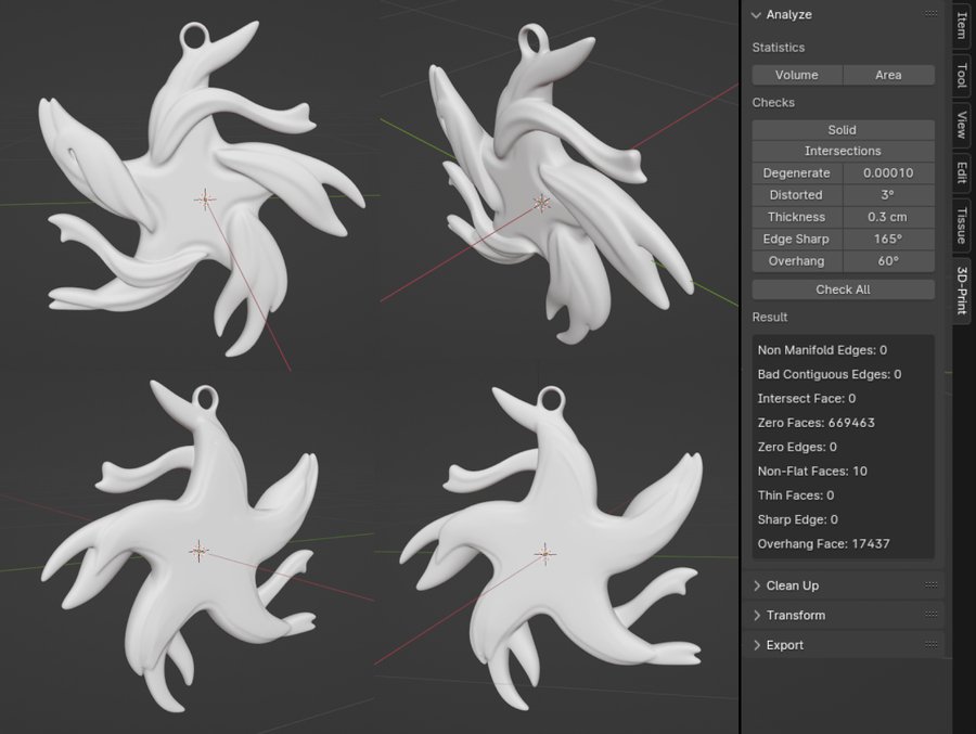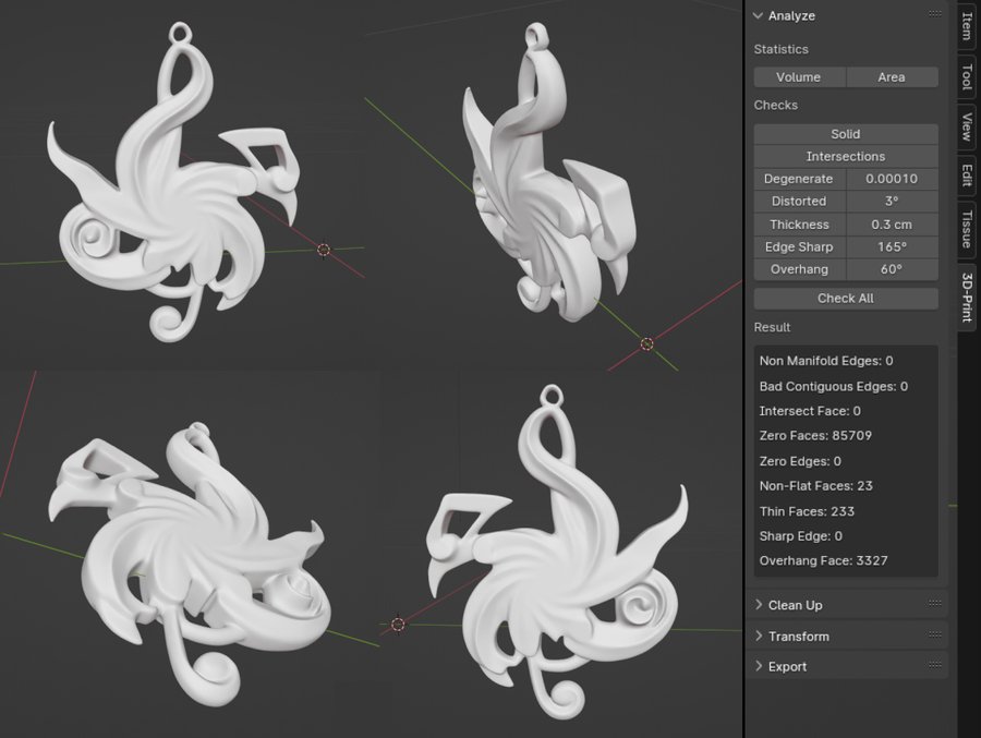 На следующем этапе итоговые промо-визуализации кулонов были загружены в нейросеть Tripo AI, которая создала базовые 3D-модели. Полученные модели были доработаны и проверены на корректность геометрии. Для предпечатной подготовки использовался аддон 3D Print Toolbox в Blender.