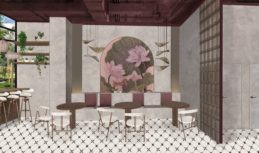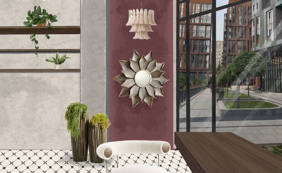 Образ пространства: • Мягкая палитра оттенков: молочный, нейтральный бежевый, бордо, светлая олива. • Зелёные растения в разных уровнях (настольные, подвесные, напольные). • Тактильные материалы: тёплое дерево, шероховатый камень, гладкая плитка. • Чёткие линии c «живыми» природными акцентами.