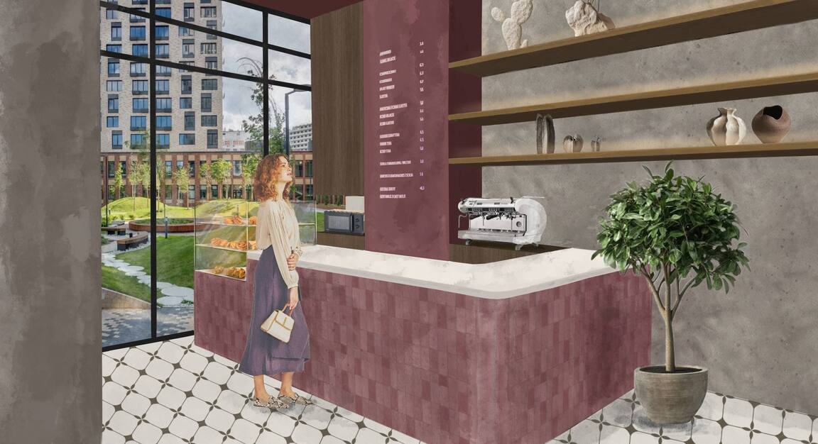 Идея: Создать светлую, воздушную, спокойную кофейню, в которой натуральные материалы и мягкие оттенки создают атмосферу отдыха. Панорамные окна позволяют залить пространство дневным светом, а высокая высота стен даёт ощущение простора. Интерьер должен вызывать чувство уюта, но при этом быть современным и стильным.