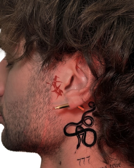 • Украшение в виде карандаша в ухе • Драматическое, неоновое освещение с цветовыми акцентами, подчеркивающими эмоциональное состояние • Крупные планы на детали • Контрастность, текстуры