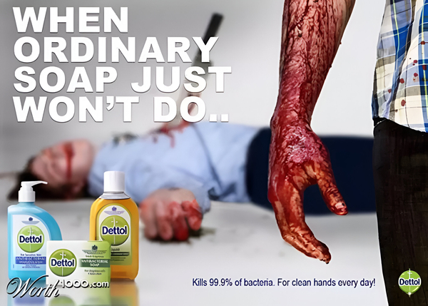 Рекламные кампании Dettol и транспорта в Лондоне очень резко высказываются о возможных экстремальных последствиях, если не пользоваться или не соблюдать правила и ценности, которые закладывают компании в свой продукт и работу.
