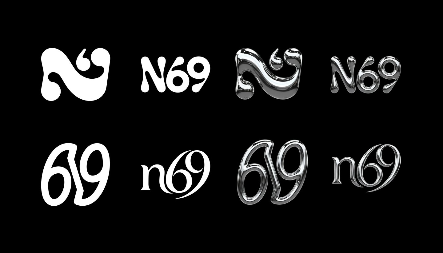 [promt] logo mark for «N69» on a black background, minimalist, black and white, abstract fluid shape that subtly incorporates the letters N and 69, they are seamlessly fused together, soft rounded curves, sensual and modern, iconic silhouette --ar 16:10 --