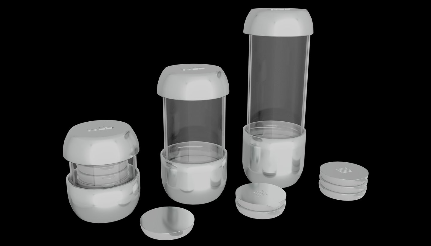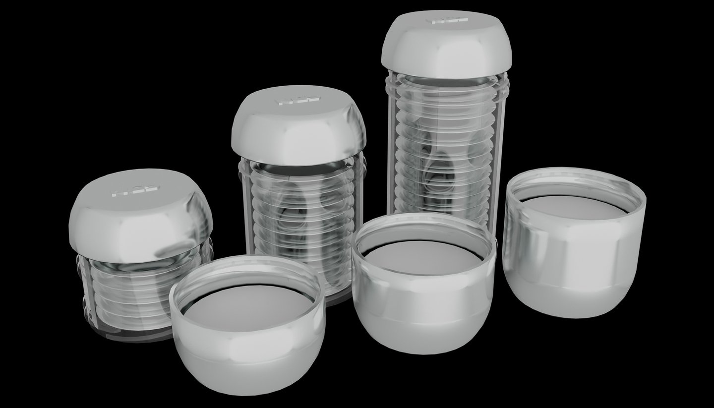 [promt_1] Photorealistic image of three cylindrical condom cases of different sizes, lined up on a black background. Each case consists of a matte white base and a transparent upper case with a rounded lid. Inside, stacks of white round disks are visible — packages of condoms. One case is open, its lid is lying next to it, demonstrating the internal structure. The other cases are closed. The light is soft, studio-like, emphasizing the smooth texture of the plastic and the transparency of the cases. Style: minimalism, product-photography. --ar 16:10 —