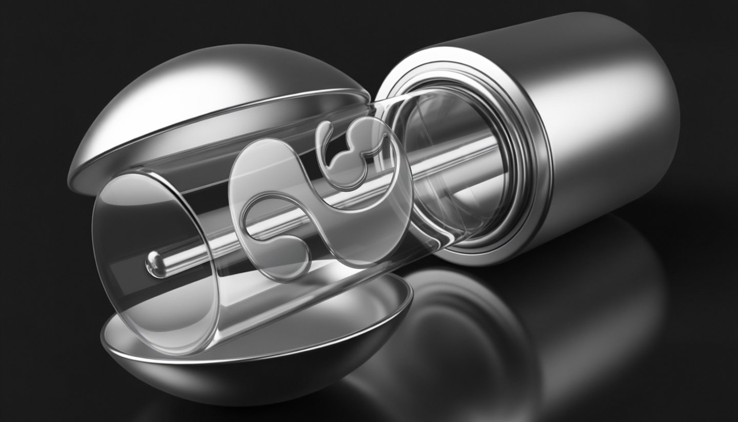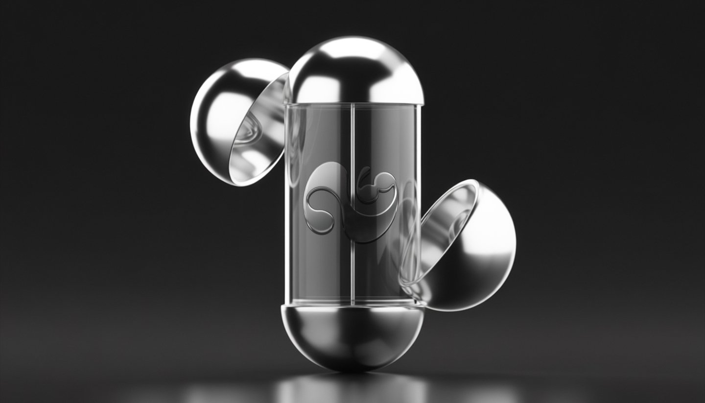[promt 1 & 2] Photorealistic 3D rendering of an elegant, futuristic lube case. The case is made of polished silver and clear glass. The cylindrical case is made of transparent glass, inside of which there is a three-dimensional logo «N69» in a modern font on a silver stick. There is a clear liquid inside the case. The case has two hemispherical covers made of shiny silver, one of which is open, demonstrating the internal structure. The light falls softly, creating realistic glare on metal and reflections in glass. The background is pure black, which emphasizes the luxury and minimalism of the design. Style: highly detailed rendering, as in luxury goods advertisements. --ar 16:10 --