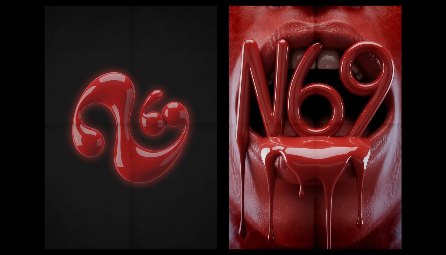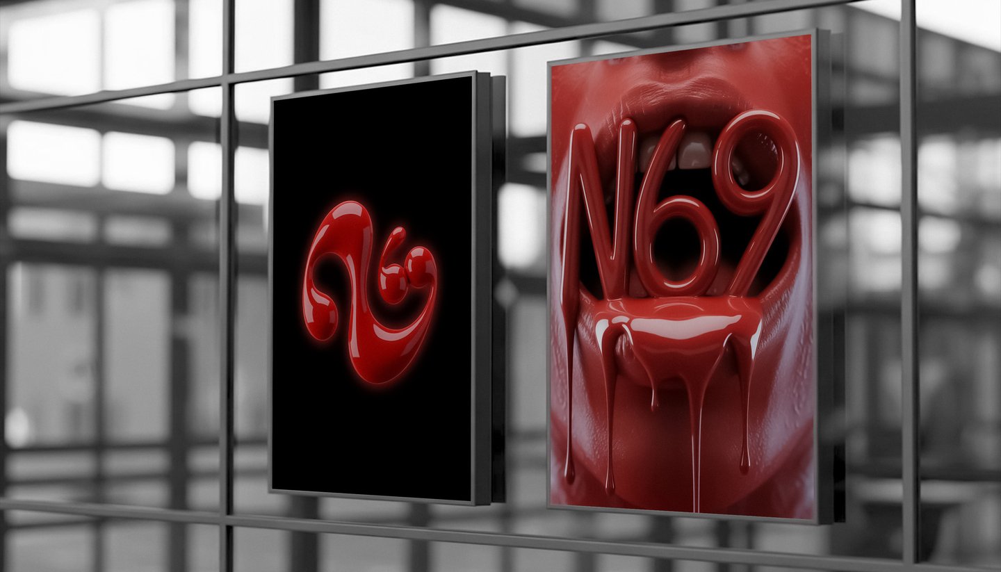 [promt 2] A striking and provocative poster, hyper-realistic, studio photography. The number «N69» is written in a thick, glossy, dripping red liquid, cascading down into a glossy, wet, red latex mouth. The background is a seamless, textured red latex. Dramatic studio lighting creates deep shadows and bright highlights, enhancing the sensual and slightly horrifying vibe. Cinematic, high contrast, 8K. --ar 3:4 --