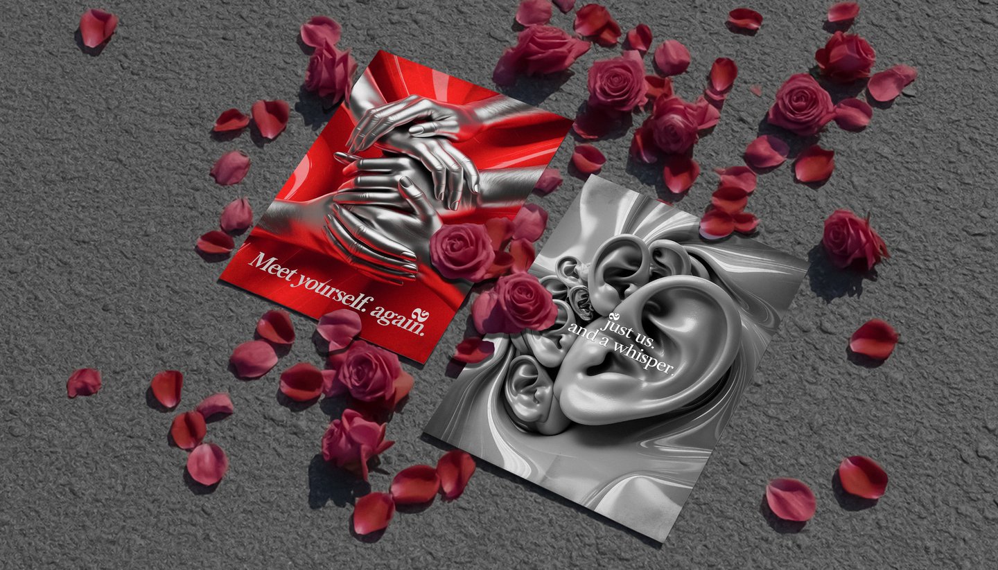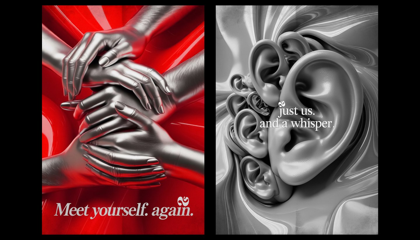 [promt 2] Photorealistic poster, hyperdetailed, macro photography, a collage of diverse silver ears, sculptural, tactile, gently touching each other, on an iridescent shimmering background of liquid metal and silk. Elegant composition, depth of field, cinematic lighting, soft shadows. Text in a sensual serif font: «Just us. And a whisper. Cinematic, high-contrast image in 8K format. --ar 3:4 --