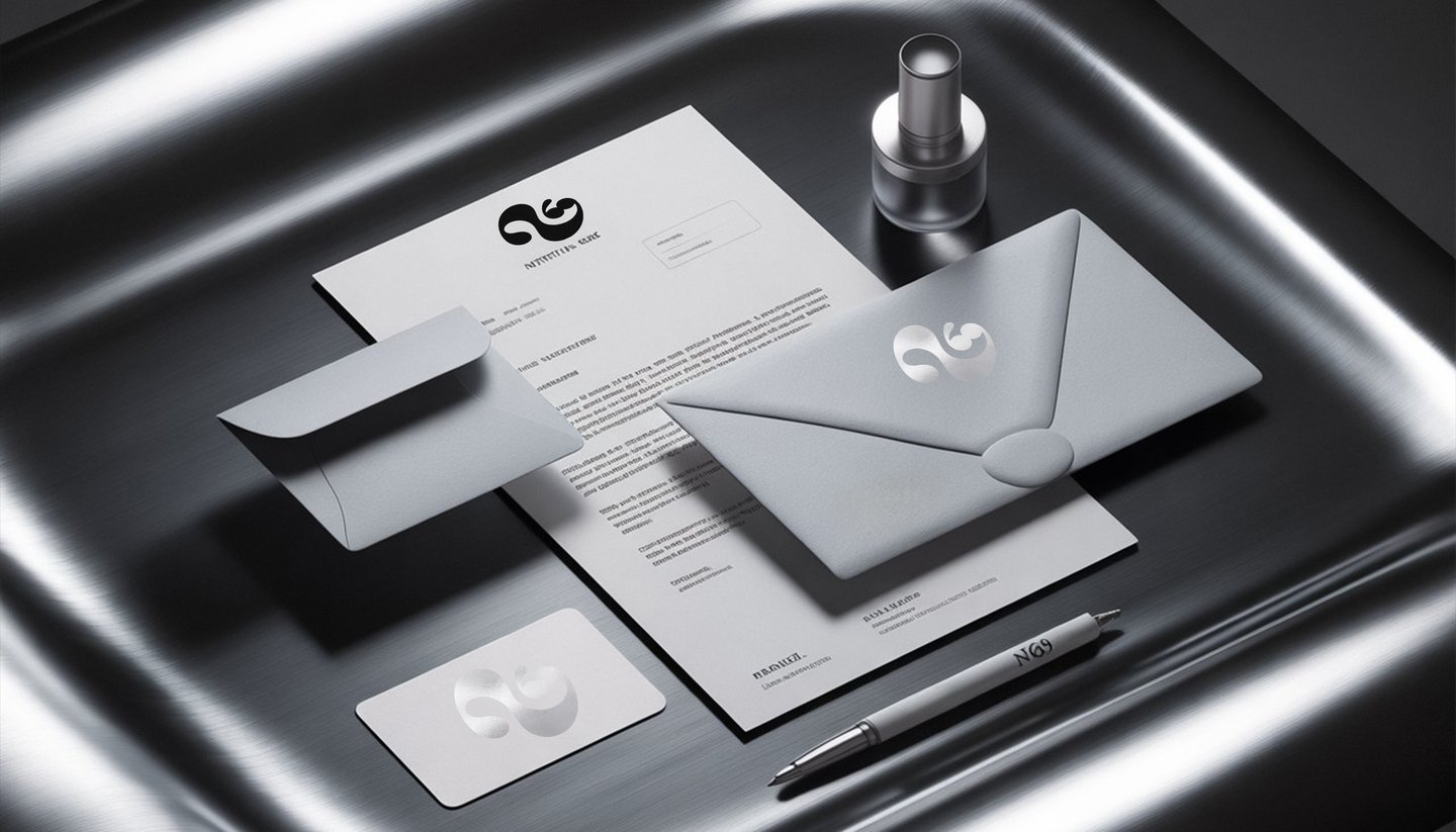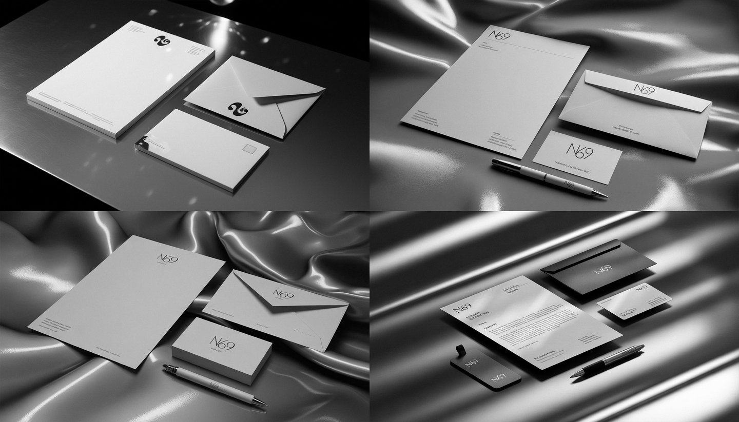 [promt 1] A photorealistic set of corporate identity elements for a small brand of intimate goods called «N69». It is located on a glossy, reflective metal surface with soft light highlights and flickering reflections. The composition includes: a letterhead with the N69 logo, a matching red envelope, a minimalistic business card in the form of red lips, and a pen with the N69 logo laser-engraved. Style: sophisticated, elegant, minimalist. Color scheme: monochrome, black and white with silver tones. Lighting: dramatic studio lighting, creating deep shadows and crisp specular highlights on the metal. Shot with a professional macro lens, ultra-detailed, 8K, hyperrealistic. --ar 16:10 —