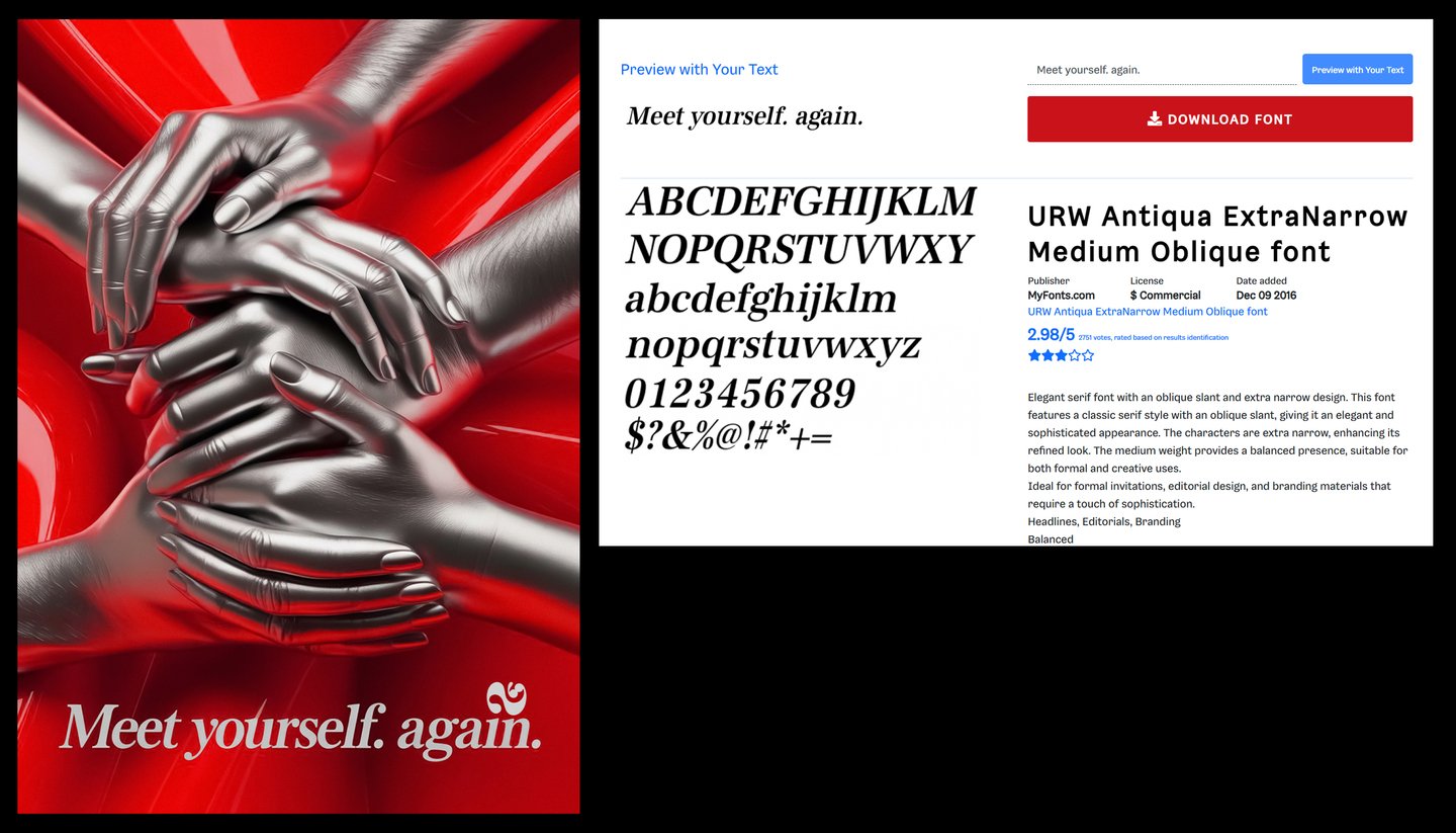 [promt 1] A hyperrealistic poster collage. On a bright, glossy, vibrant red background, a composition of multiple photorealistic silver hands of different genders and ages. The hands are tenderly and carefully touching each other, forming an intricate structure that conveys a sense of support and tactility. Cinematic, dramatic lighting with highlights on the polished silver. At the bottom, a slogan written in a sensual serif font: «MEET YOURSELF. AGAIN.» High detail, 8K, hyperrealism. --ar 3:4 —