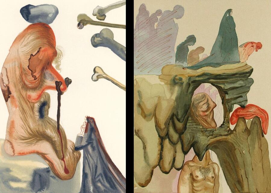 Слева направо: «Души Паоло и Франчески», Гюстав Доре, 1861 «Содомиты», Сальвадор Дали, 1963
