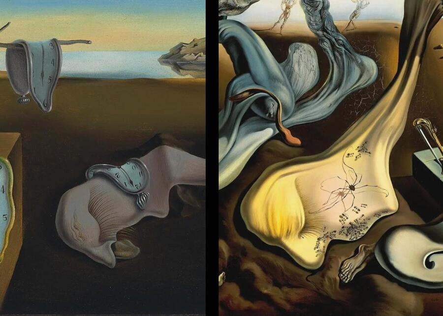 Слева направо: «Корумпированные»(1963), «Льстец»(1963), «Постоянство памяти»(1931), «Вечерний паук сулит надежду»(1940), Сальвадор Дали