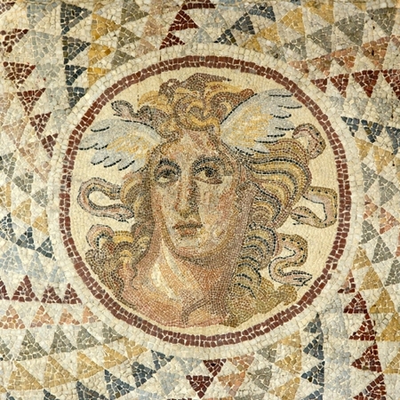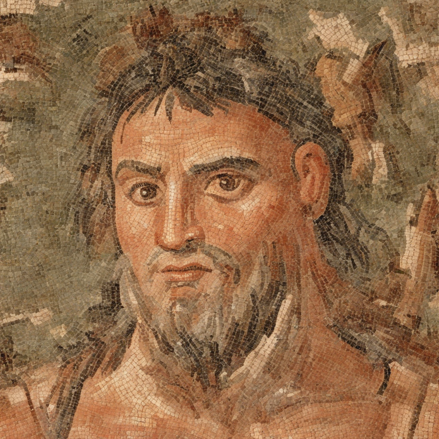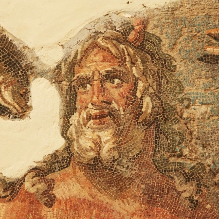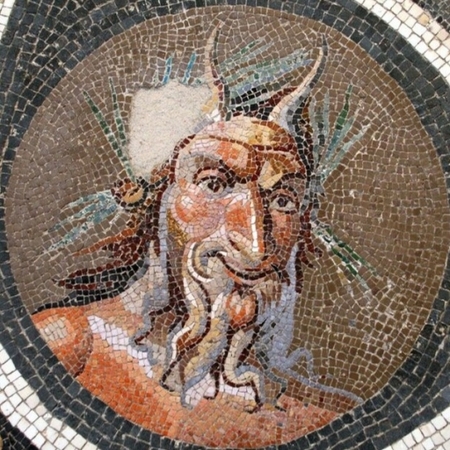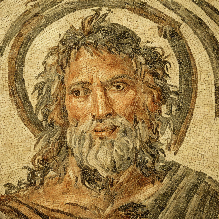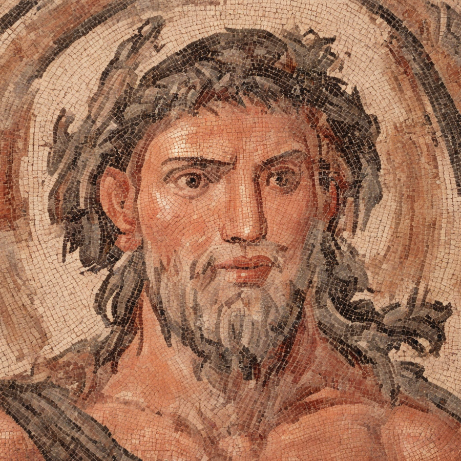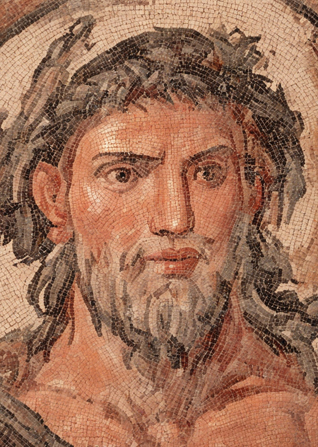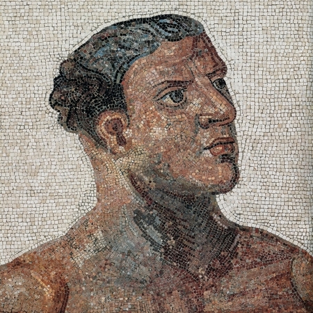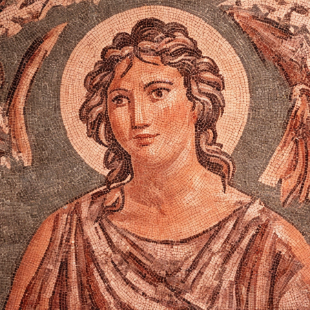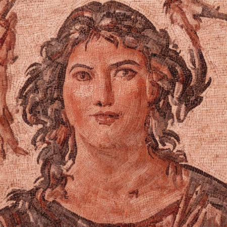 На генерации выше видно, что искусственный интеллект способен повторять палитру мозаичных панно и добавлять круглые рамки, которыми обычно обрамлялись портреты на античных мозаиках.