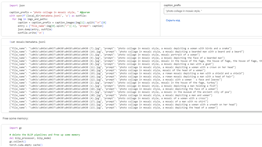 Подписи готовы, и стало видно, что нейросеть дала очень точные подписи к мозаикам, а следовательно она действительно их распознаёт и код работает корректно.