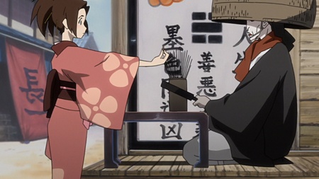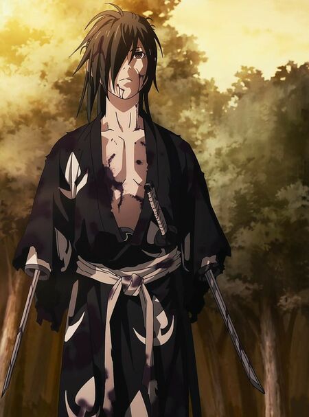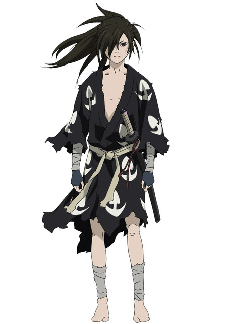 Образ главного героя — Хяккимару концентрирует в себе эту идею предела. Его одежда — укороченное тёмное кимоно с рваными краями, повязки и бинты, скрывающие искусственное тело. От традиционного комплекта остаётся лишь минимальный намёк на косодэ. Отсутствуют полноценные слои, оби, элементы, связанные с ритуалом или статусом. Фактически костюм героя существует на границе между человеческой одеждой и функциональной оболочкой для тела. Визуально это подчёркивает положение героя. Хяккимару не принадлежит ни к одному социальному слою, его одежда, как и тело, «недособрана» и постоянно находится в процессе восстановления.