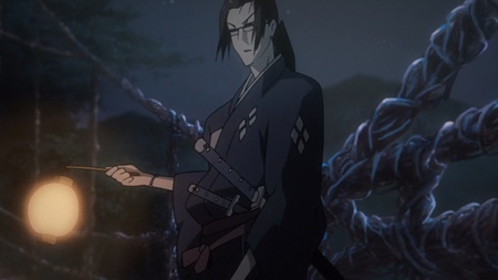 В аниме «Дороро» мотив подобного костюма появляется в облике Дайго, и затем переосмысляется в образе Хяккимару. У отца мы видим почти прямую отсылку к историческому типу: тёмное кимоно с крупным светлым орнаментом, белый пояс, чётко заданная вертикаль силуэта. У Хяккимару сохраняются та же базовая форма и тот же узор, но костюм показан в состоянии распада. Рукава и подол укорочены и разорваны, ткань изношена.