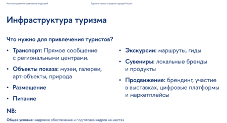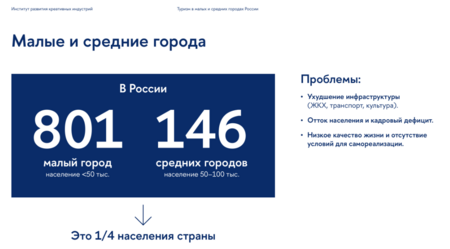 Не все поселения имеют памятники архитектуры и обладают исторической значимостью. Таким малым городам, которые образовались вокруг предприятий недавно, креативные индустрии могут помочь выделиться и стать привлекательными не только для туристов, но и для местных жителей. Меры поддержки для развития территорий оказывает не только государство, но и бизнес, особенно большой.