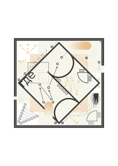 Платок «О8» — визуализация поиска причинно-следственных связей в обыденности. Он является частью серии из восьми векторных композиций, дополненных абстрактными пятнами туши, напечатанных на ткани.