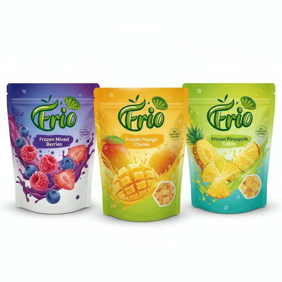 Create a cohesive set of frozen fruit packaging designs featuring the FRIO logo prominently, incorporating graphic elements from the brand’s corporate identity. Each package should vividly convey the fresh, natural taste of the fruit inside through colorful, appetizing illustrations and textures that evoke cold freshness and juiciness. Use a clean, modern style with vibrant colors and frosty visual effects to emphasize the frozen aspect. Maintain consistent typography and logo placement across all designs to ensure brand recognition. The packaging should be suitable for high-resolution print with clear, legible details. Нейросеть: ChatGPT