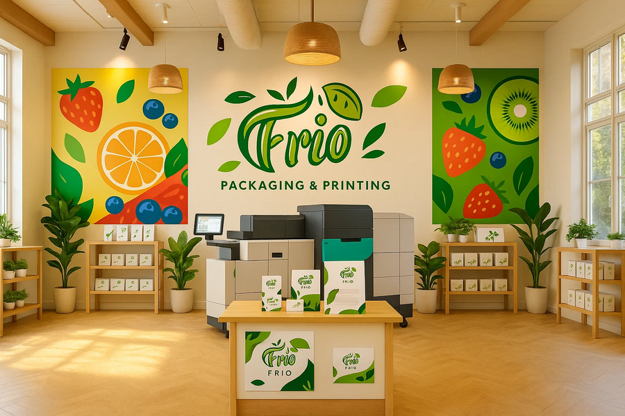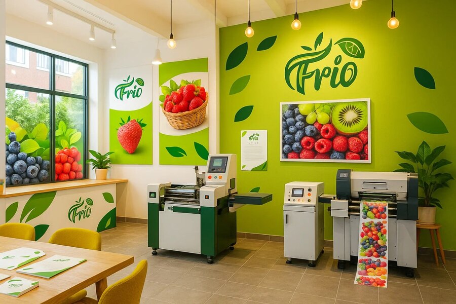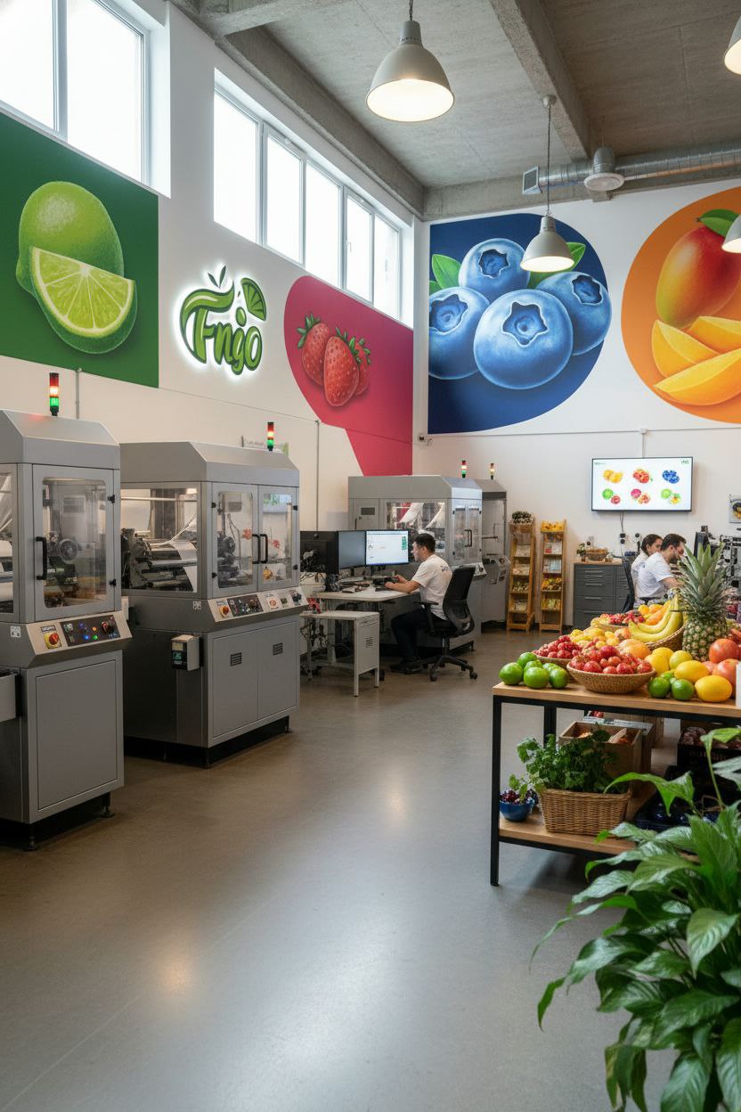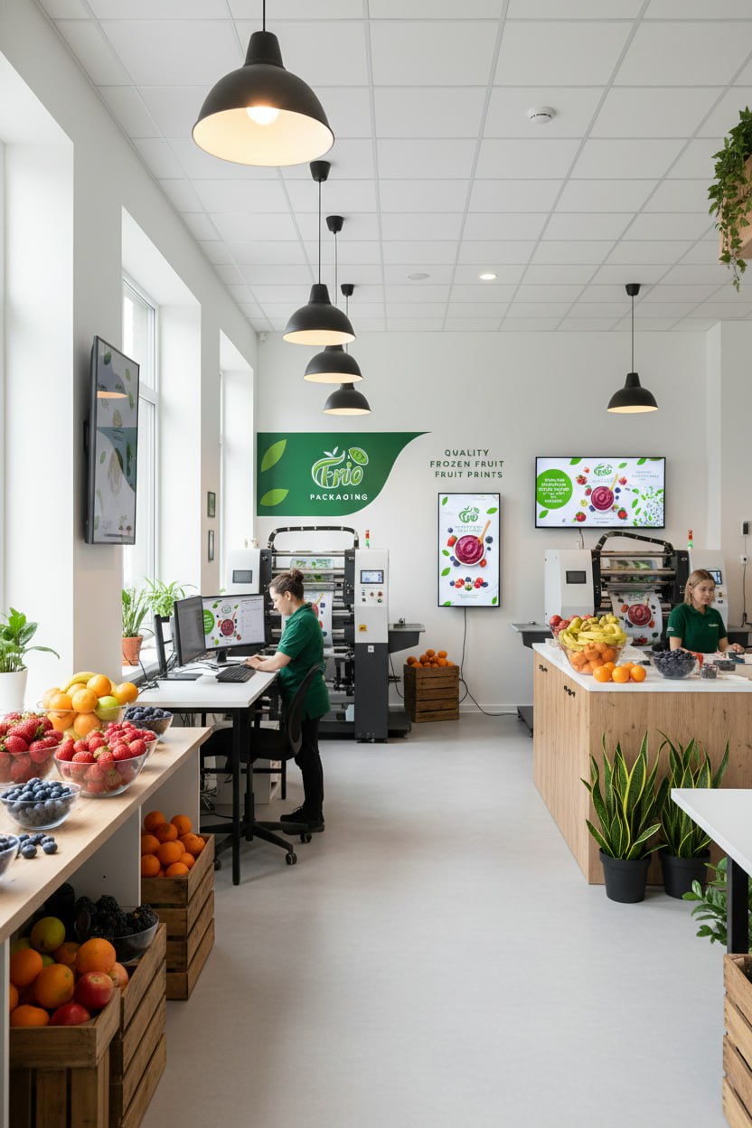 /image prompt: create a cozy production facility designed according to the provided corporate identity, specializing in printing packaging for frozen fruits. The interior should feature vibrant displays of fresh fruit, combining bright, cheerful colors and positive, welcoming design elements that reflect the brand’s values. The space is well-lit with natural and warm artificial lighting, creating an inviting atmosphere for both workers and visitors. Include modern printing equipment integrated seamlessly into the environment, with clean, organized workstations and branded signage throughout. The overall style is contemporary and friendly, emphasizing freshness and quality, captured in a wide-angle view to showcase the facility’s layout and ambiance. Нейросеть: nanobanana