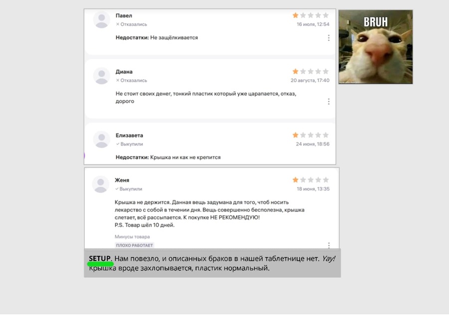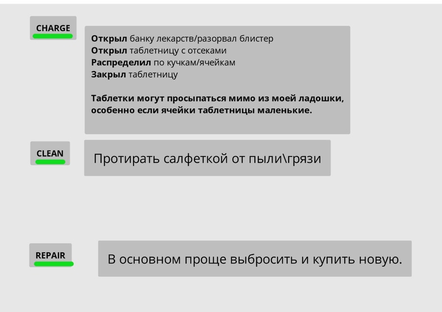 Острейшие проблемы — некомфортно взаимодействовать с крышкой, сложно быстро фасовать таблетки, есть вероятность уронить таблетки при открытии крышки, особенно при отсутствии опоры на стол.