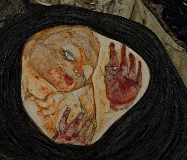 Интересной с точки зрения работы с пятном является работа «Мёртвая мать I». Здесь с помощью пятна Шиле расставляет смысловые акценты. На фоне двух больших чёрных плоскостей выделяются светлые лица матери и ребёнка. Особенно выразительным выглядит изображение ребёнка: за счёт цветового и тонового контраста она становится центром композиции. Округлое пятно, в которое заключено лицо и ручки как бы огораживает, охраняет дитя от внешнего мрачного мира.