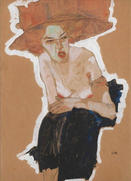 Эгон Шиле, Лежащая полуобнажённая в красной шляпе, 1910