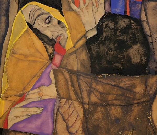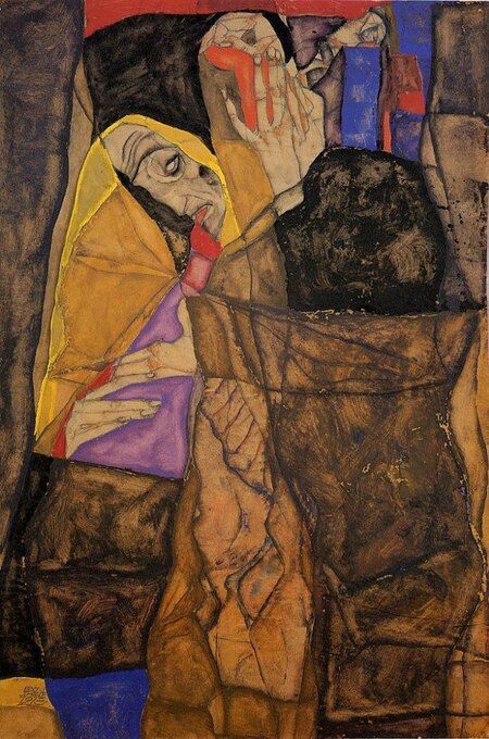 Посмотрим, как работают цветовые пятна на работах «Кардинал и монахиня» и «Пророки». Каждый предмет одежды и каждая часть тела выделена своим локальным колоритом, что сближает здесь манеру Шиле с раннеренессансным живописным мышлением. Выразительности художник добивается с помощью цветовых контрастов: красное пятно одежды кардинала — чёрное пятно одежды монахини, тёмное пятно фона — светлое пятно тела на автопортрете.
