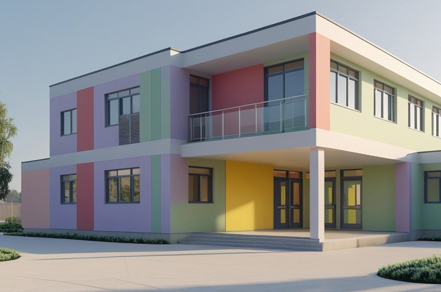 Calm, intelligent, and contemporary building, designed as a conceptual modern school.
