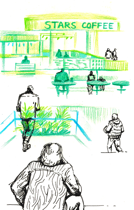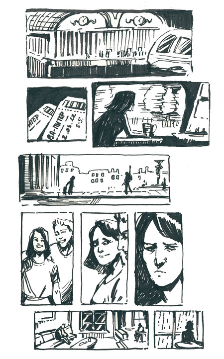 Слева: работа с негативным пространством, рисование с натуры в ТЦ. Справа: комикс-упражнение по передаче настроения пляжного отдыха.