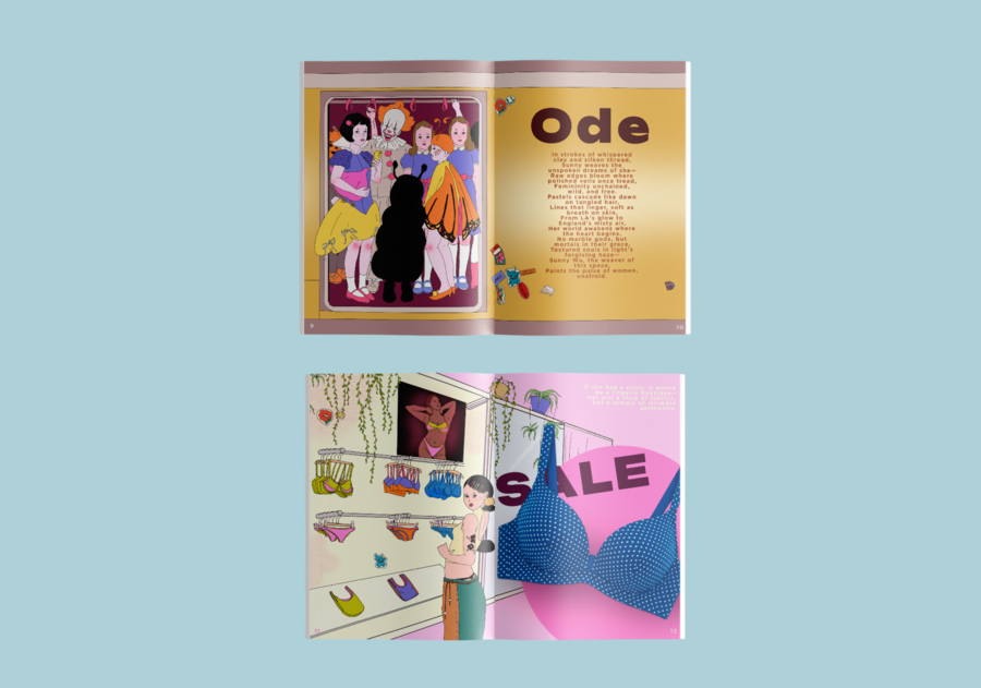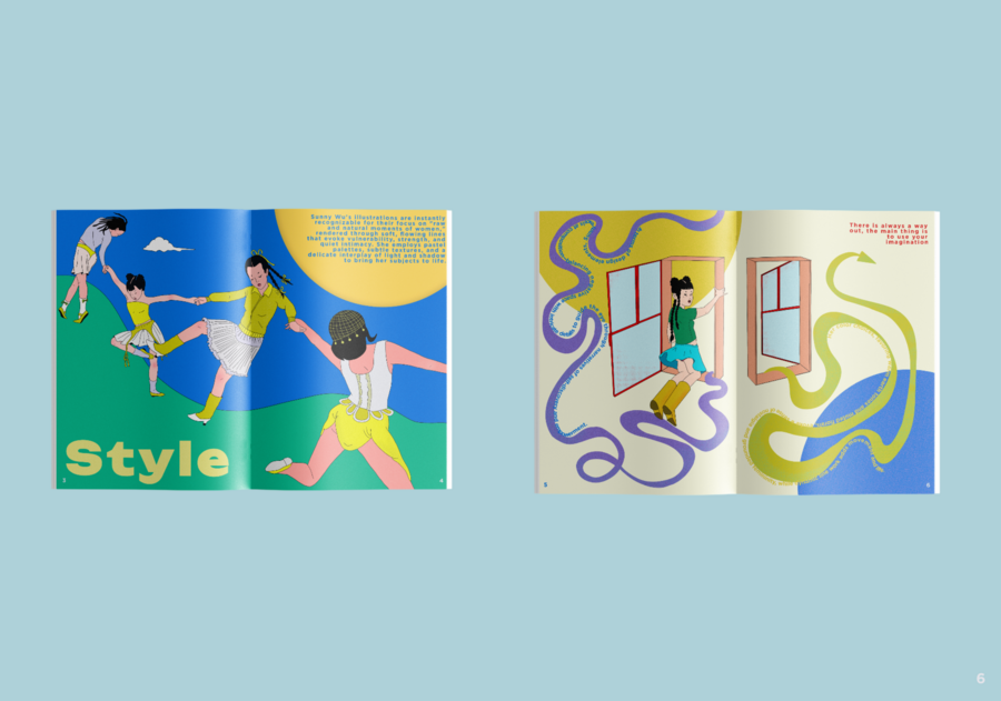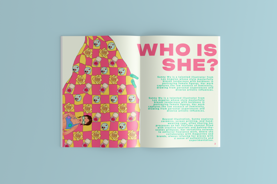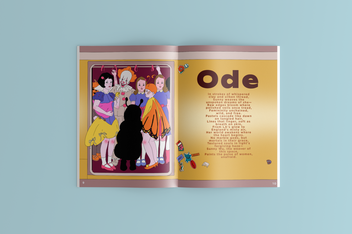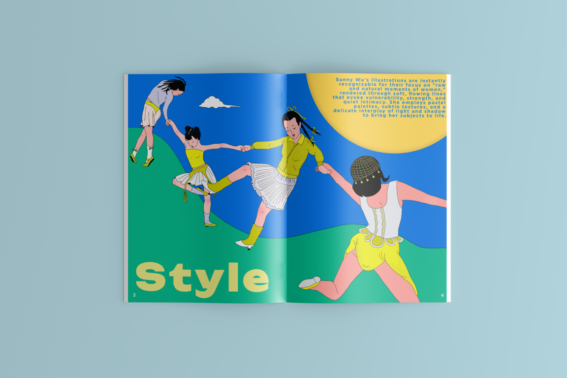 Первый журнал — деконструкция художницы Sunny Wu Sunny Wu — талантливая иллюстраторша из Лос-Анджелеса, чей стиль сочетает нежность и смелость в изображении женских образов. Стиль Sunny Wu узнаваем по акценту на «естественные моменты женщин»: мягкие, текучие линии передают эмоции, уязвимость и силу, часто с пастельными тонами и текстурными деталями.