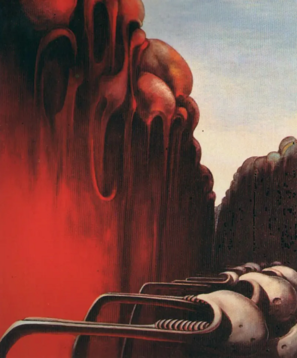 Гигер, как и сюрреалисты, часто прибегает к изображению бесформенного и текучего. Его пейзажи издалека похожи на обрывы, водопады, но при детальном рассмотрении будто состоят из множества плавящихся масс.