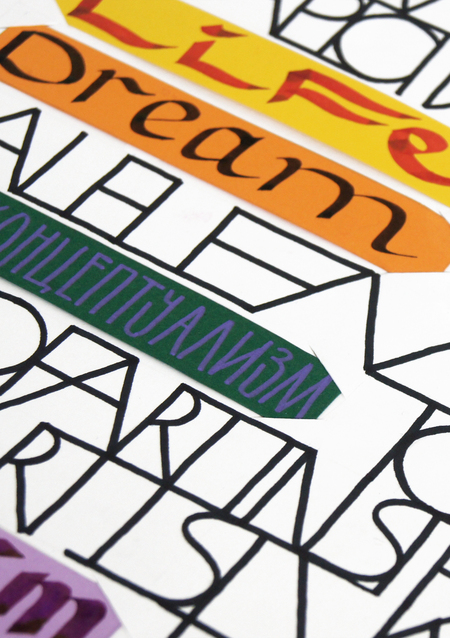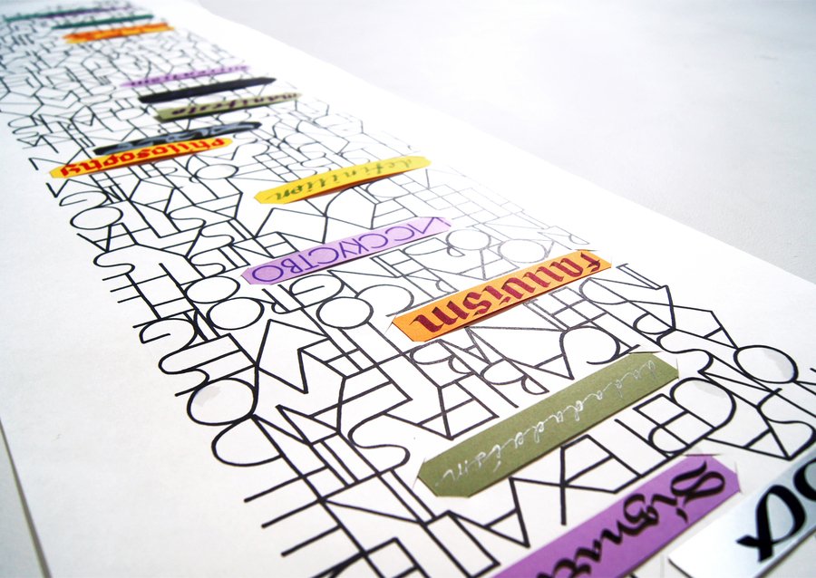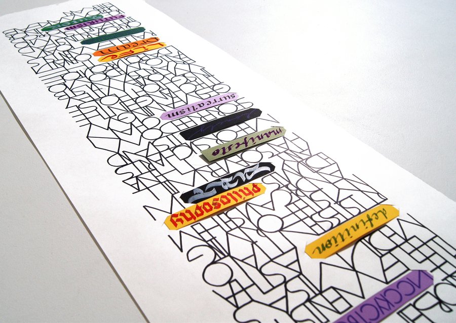 Весь манифест существует в виде длинного свитка. Основной текст написан плотно и монотонно, и прерывается пробелами для вставки своих «ответов», написанных в разных стилях на цветной бумаге.