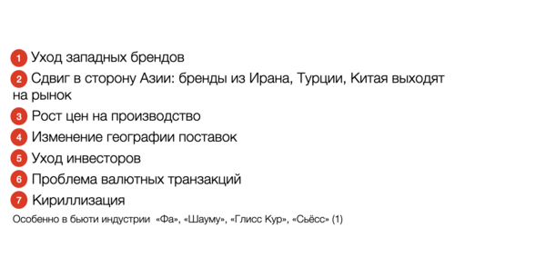 (1) Локализация производства в РФ (2) Региональная доступность (3) Омниканальность (4) Расширение линеек смежных и новых категорий (5) Близость к клиенту (6) Внедрение локальной идентичности, как способ повышения лояльности (7) Рациональность (кэшбэк, рассрочка)