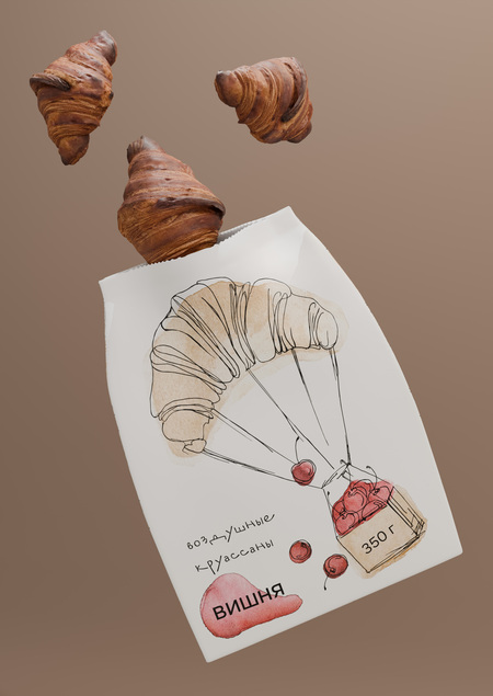 В качестве метафоры был выбран воздушный шар, который гиперболизированно подчёркивает воздушность и нежность круассанов: они кажутся настолько лёгкими, что взлетают.
