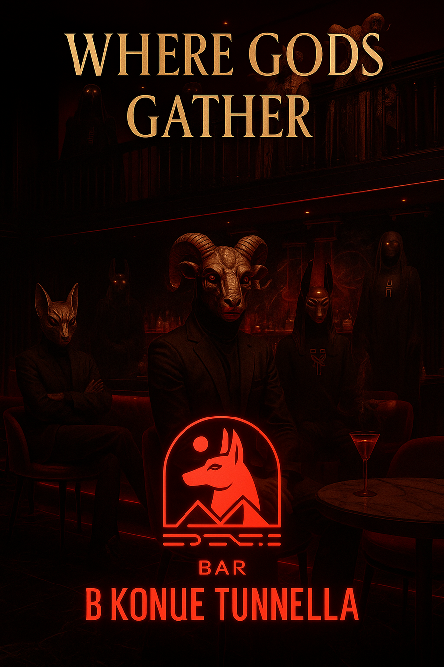 Промт: Сгенерируй постеры для бара в котором собираются боги и сущности, логотип второе изображение, первое изображение внутренний стиль, вертикальные постеры, Таинственность и элитарность («Бар для тех, кто знает, что ждёт в конце туннеля»), на английском, в едином визуальном стиле, надписи на английском: