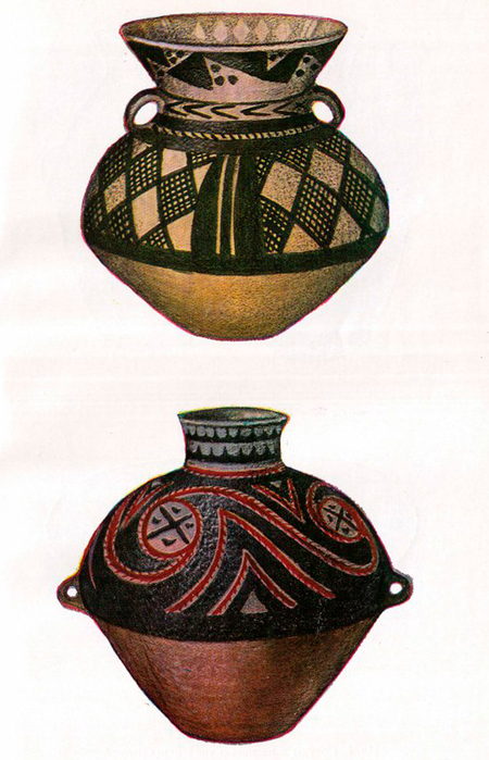 Луншань, кубок со стеблевидной ножкой, около 2000 г. до н. э. Маджая́о, кувшин с чёрным узором, ок. 3000 г. до н. э.