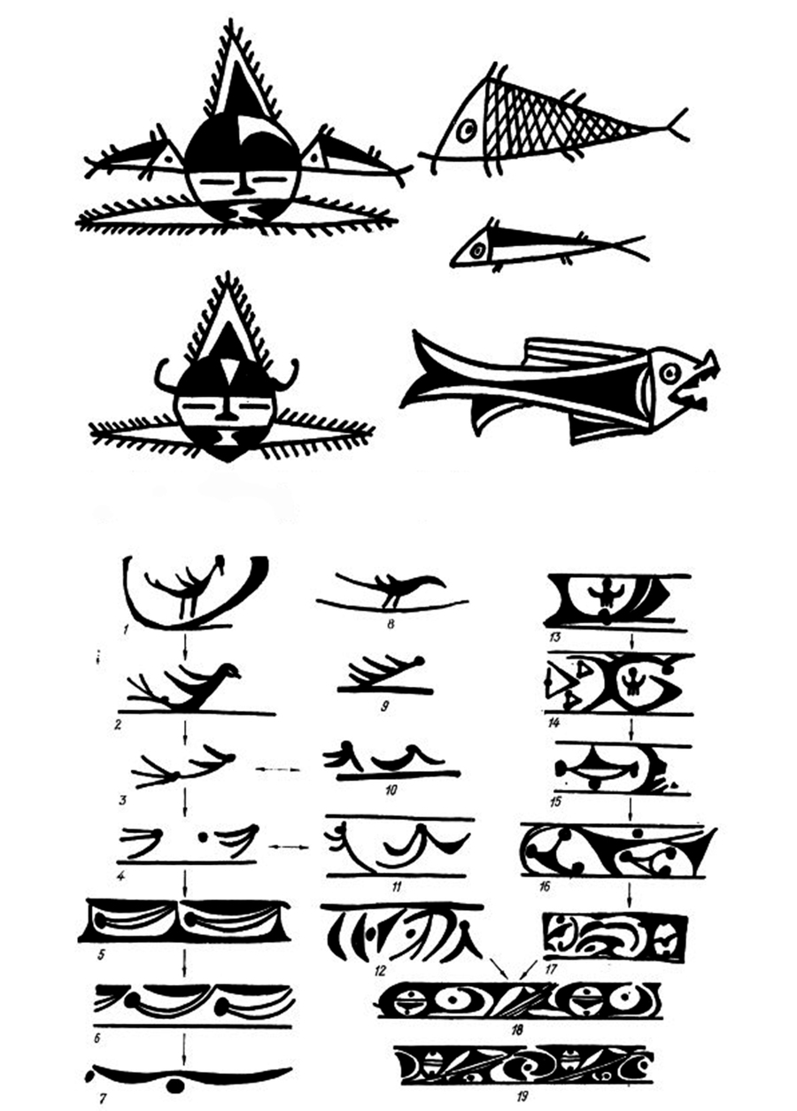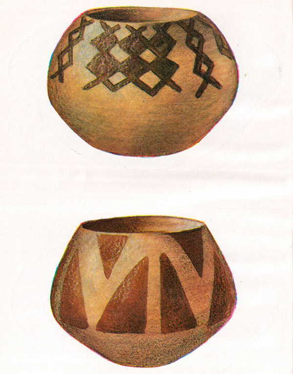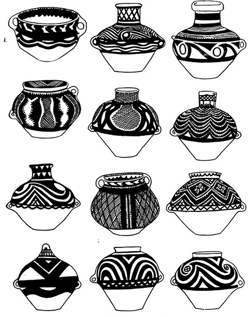 Они осваивали многочисленные варианты узоров, изображали людей, рыб, геометрические фигуры, волны. Каждый элемент выглядит уникально и сочетается с остальными. Кроме того, был изобретен ангоб, и изделия начали расписывать красками. Сосуды покрывались чёрными, красными, коричневыми и белыми пигментами, что придавало им утонченность.