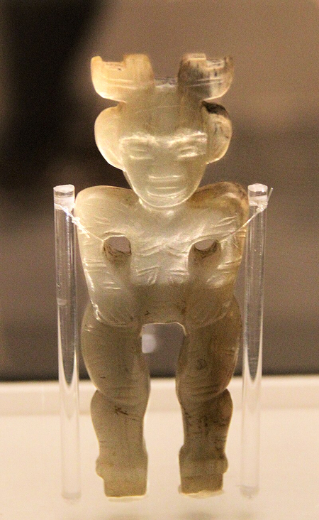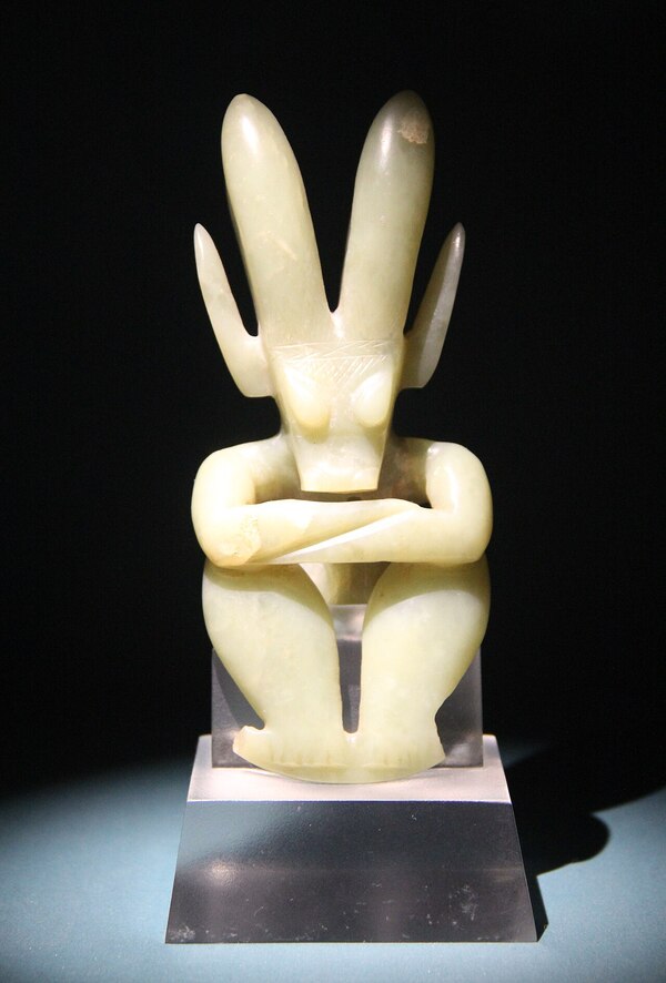 Нефритовый гуманоид, культура Хуншань, 4700–2900 гг. до н. э. Нефритовая фигурка человека, династия Шан, 1600–1045 гг. до н. э.