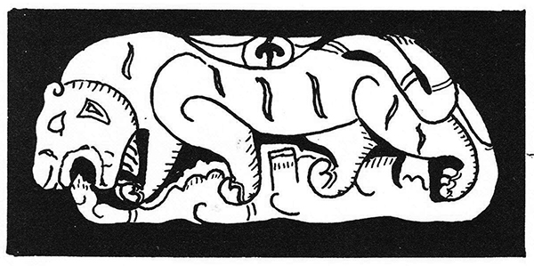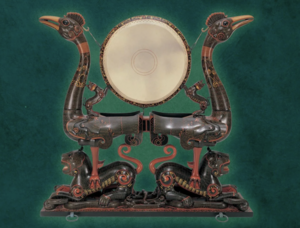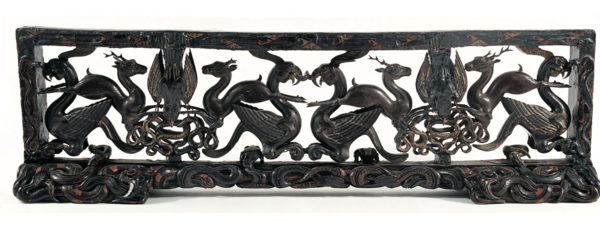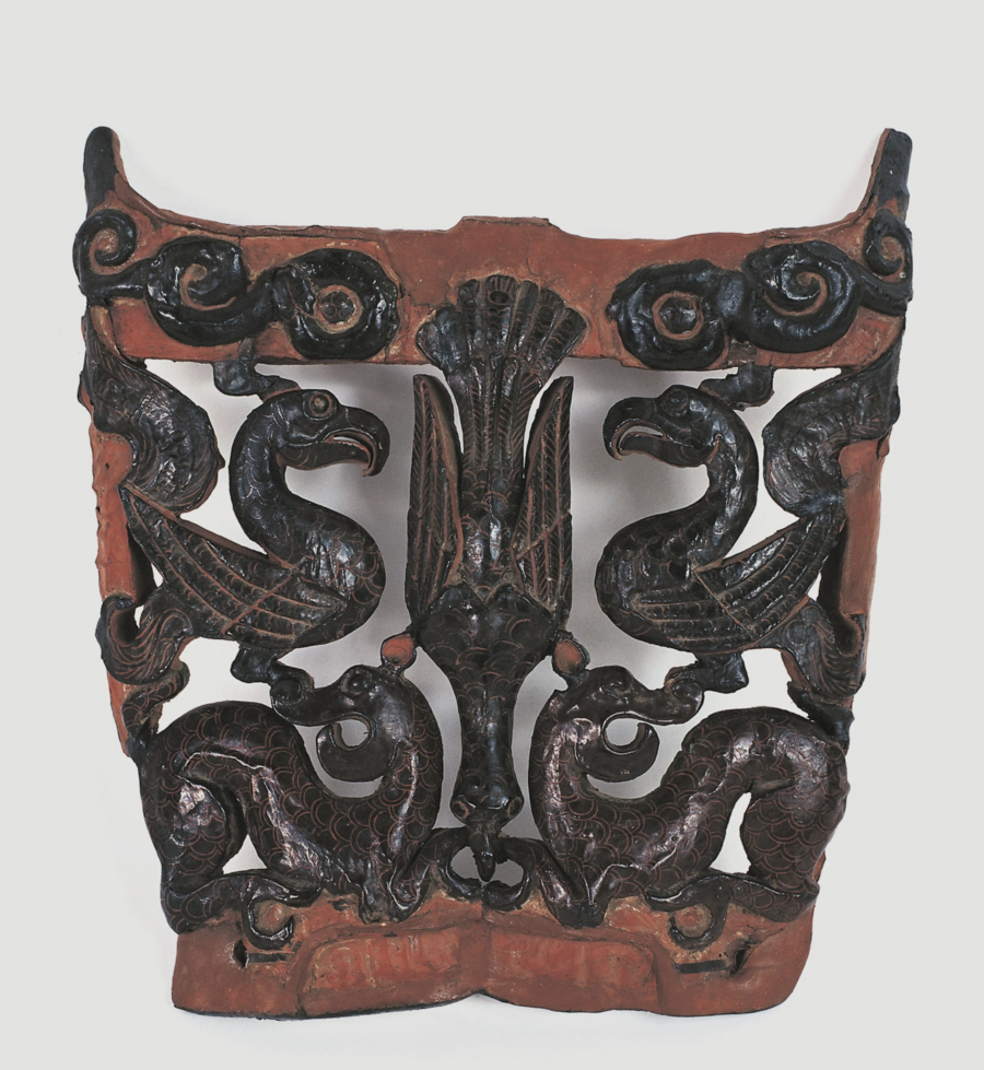 Подставка с аулюрными узорами фениксов, оленей, змей и мифических зверей. Окрашенный барабан с дизайном пьедестала в виде фениксов на спине тигров, ок. 330 г. до н. э.