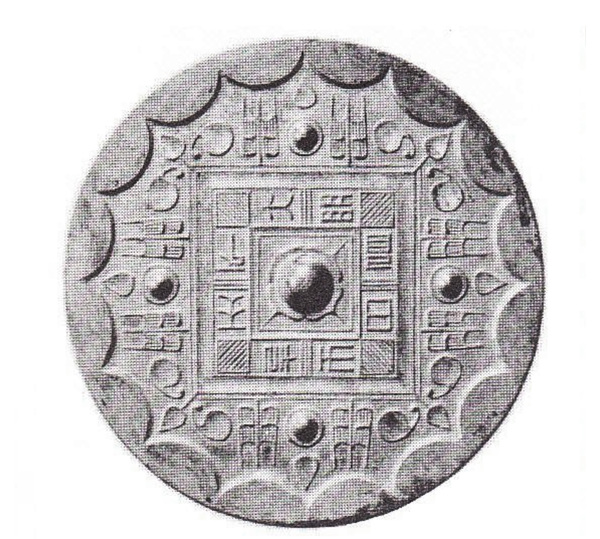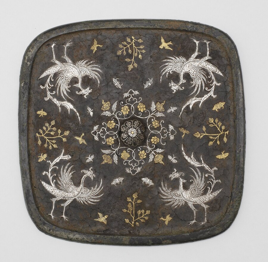 Зеркало (оборотная сторона) с квадратным магическим орнаментом, соответствующим четырем сторонам света. Ажурная накладка для мебели тао-тё и птицы. Период Хань.