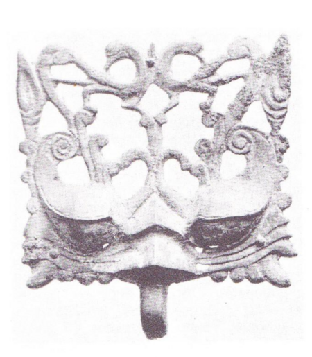 Следует упомянуть и бронзовые украшения на изделиях из дерева. Мы можем увидеть интересную накладку в виде маски тао-тё, держащей в пасти кольцо.